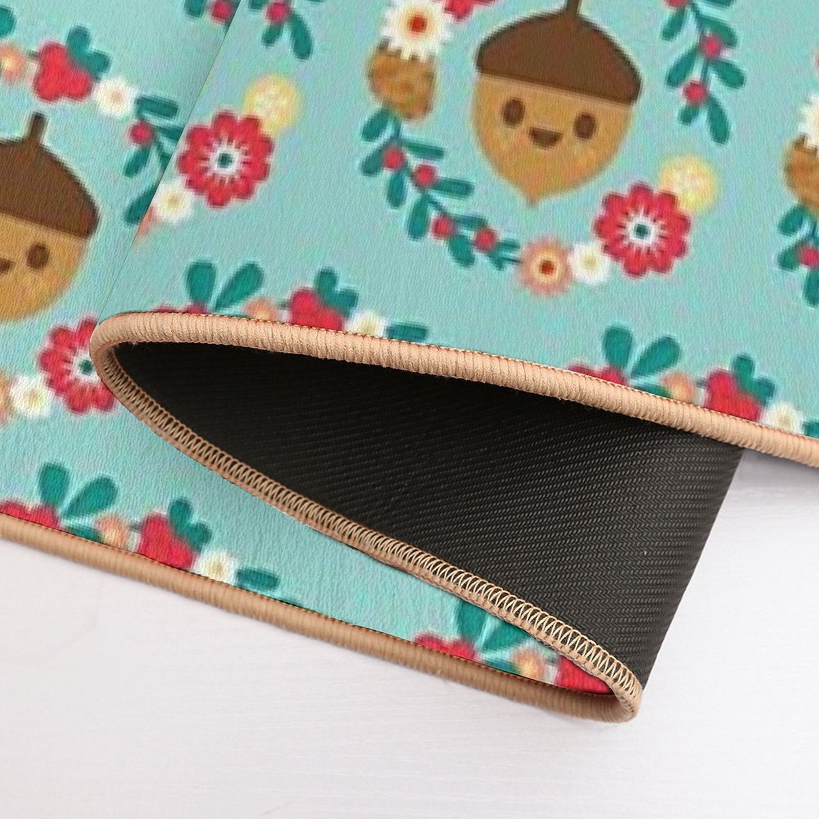 - Non-slip rubber backing grips floors securely, ideal for Acorn And Flowers Pattern Design Blue Mat placements on tiles, wood, or marble.