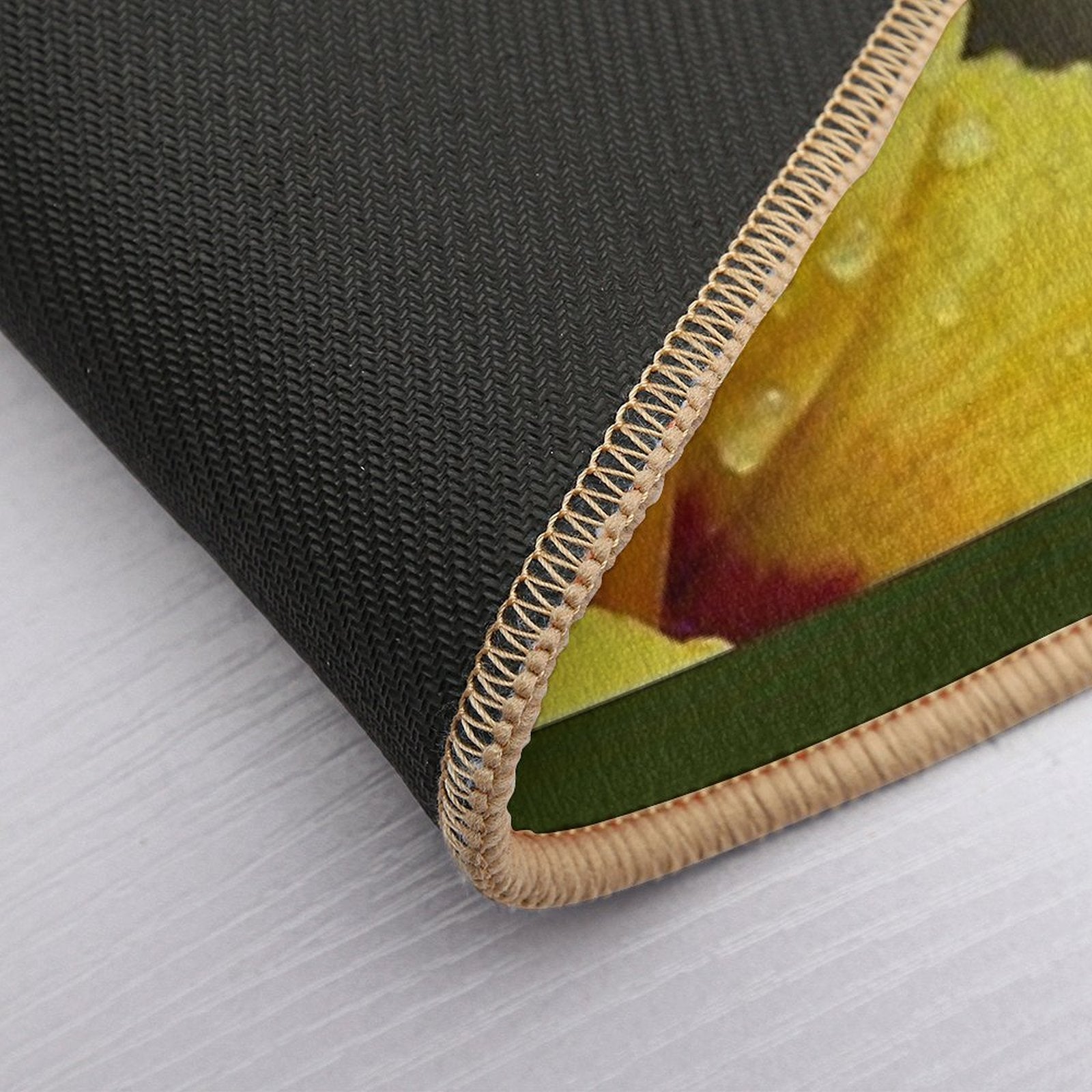 - Non-slip rubber backing grips floors securely, ideal for Bright Yellow Hibiscus Bloom in Sunlight Mat placements on tiles, wood, or marble.