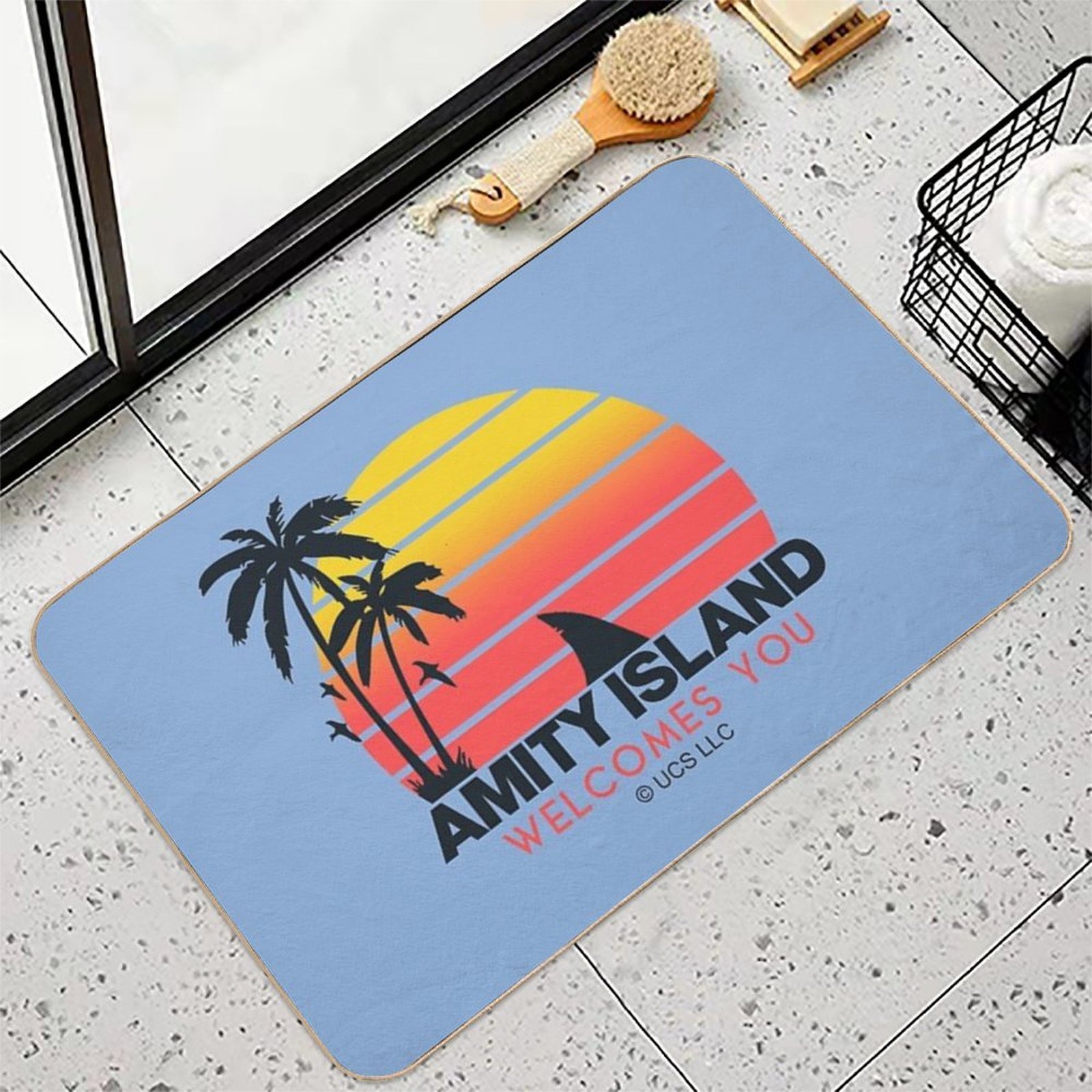 - Non-slip rubber backing grips floors securely, ideal for Jaws Movie Amity Island Welcomes You. Birthday Party Gifts. Officially Licensed Merch. Mat placements on tiles, wood, or marble.