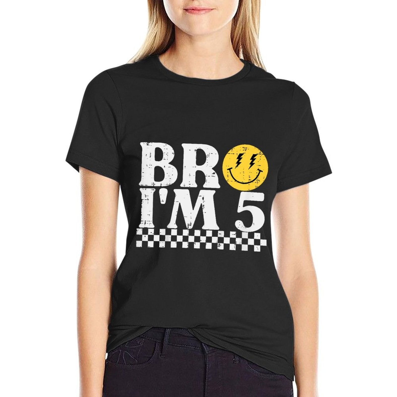 - Avoid bleach to preserve the Kids 5th Birthday Bro Im 5 Smile Retro Groovy Boys Girls Kids T-shirt’s bold graphics and cotton integrity.