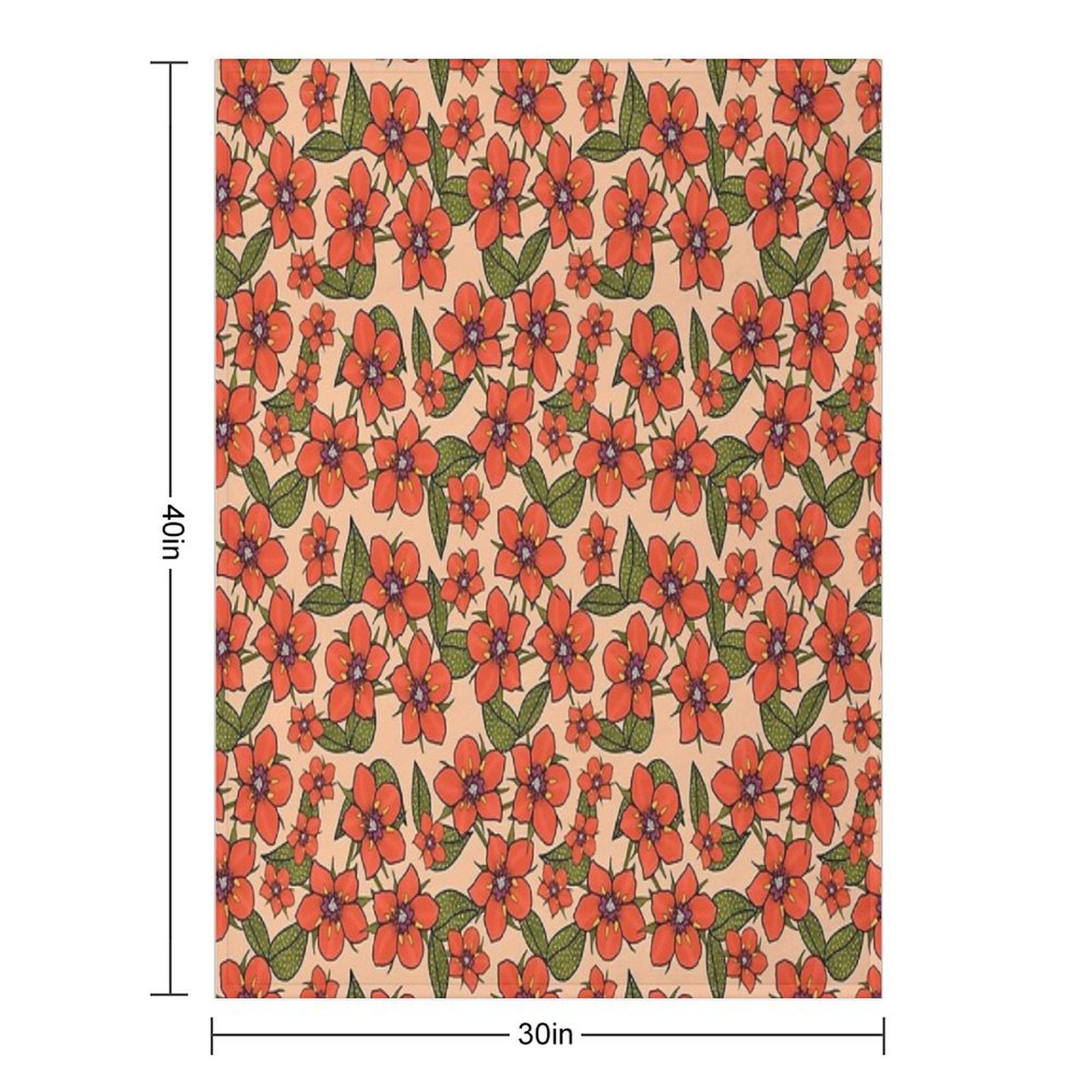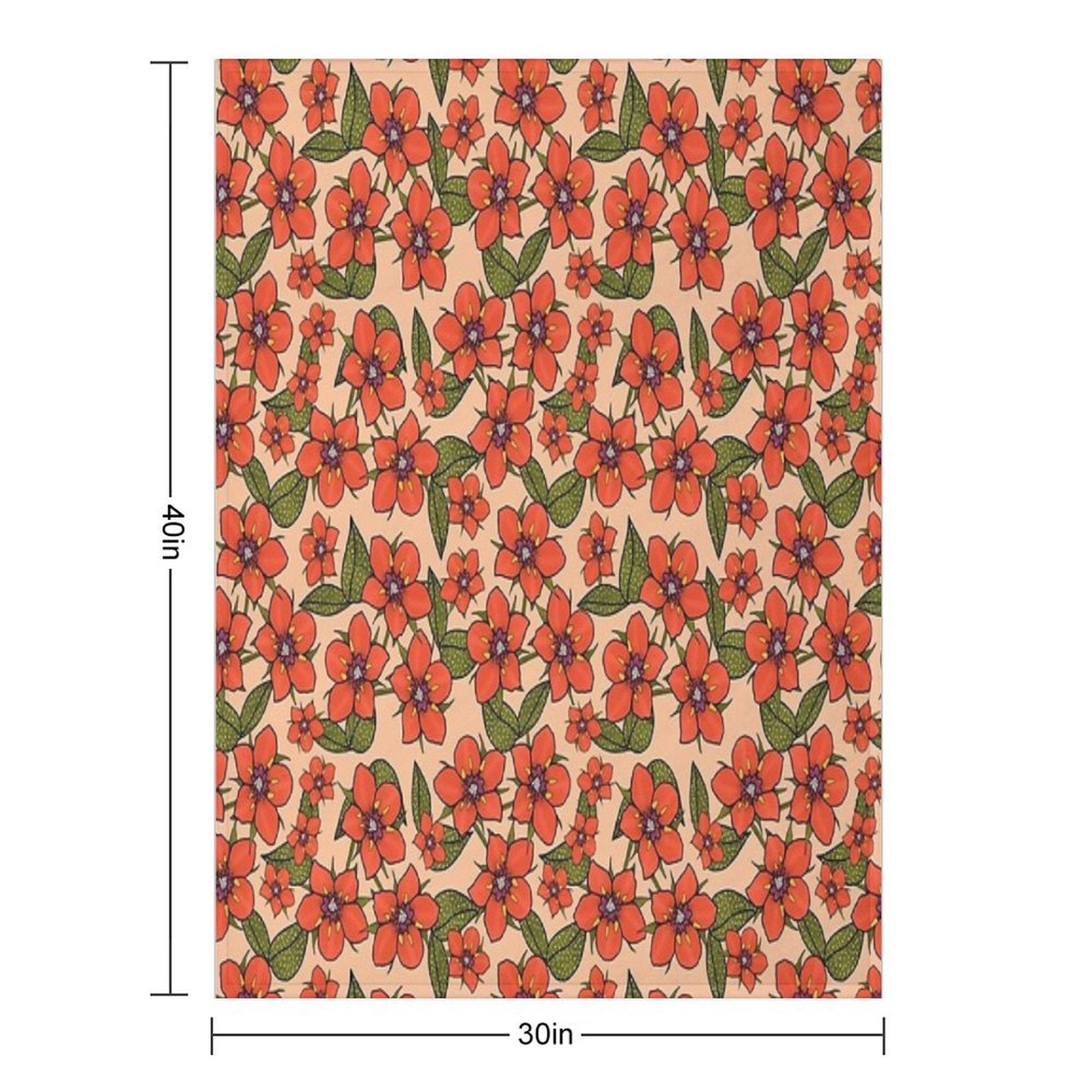 Scarlet Pimpernel Floral Design, Red And Purple Flowers with Green Leaves on A Peach Fuzz Background Blanket Size Chart: