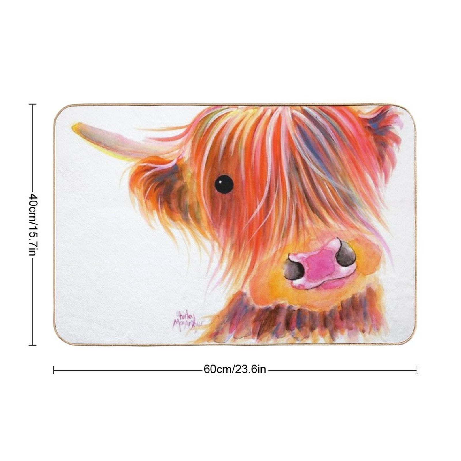 - Non-slip rubber backing grips floors securely, ideal for Scottish Highland Cow PRiNT ' SWEET SATSUMA ' by Shirley MacArthur Mat placements on tiles, wood, or marble.
