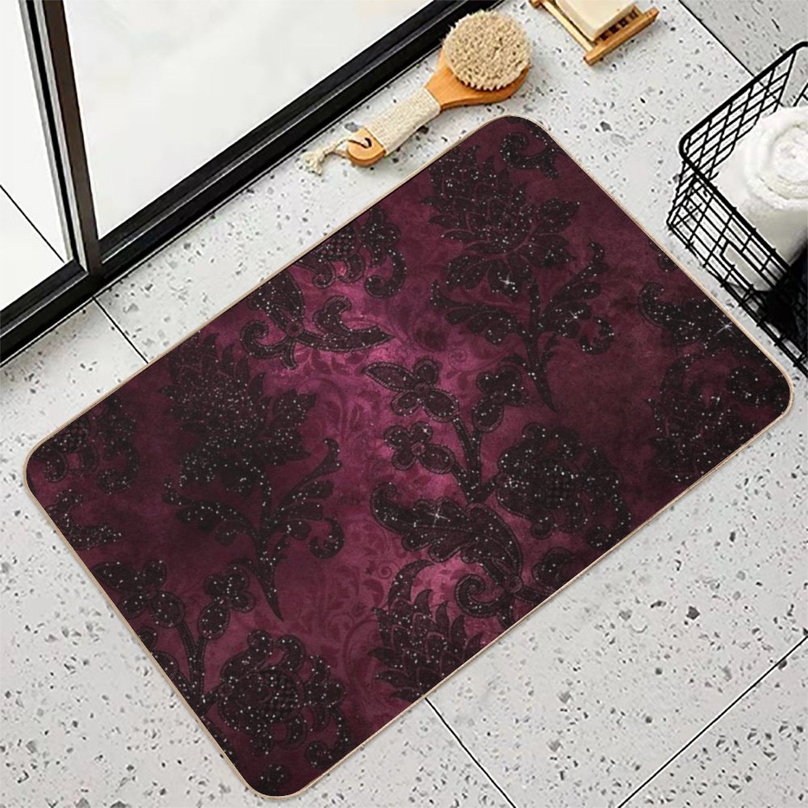 - Non-slip rubber backing grips floors securely, ideal for Vintage Glamour Burgundy Damask Mat placements on tiles, wood, or marble.